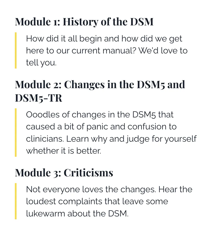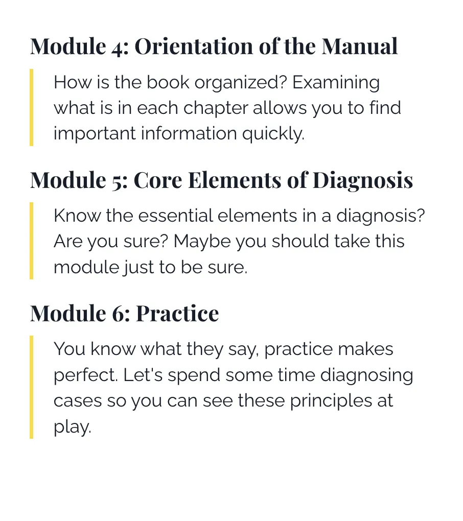 Practice diagnosis using the DSM5 through clinical vignettes.